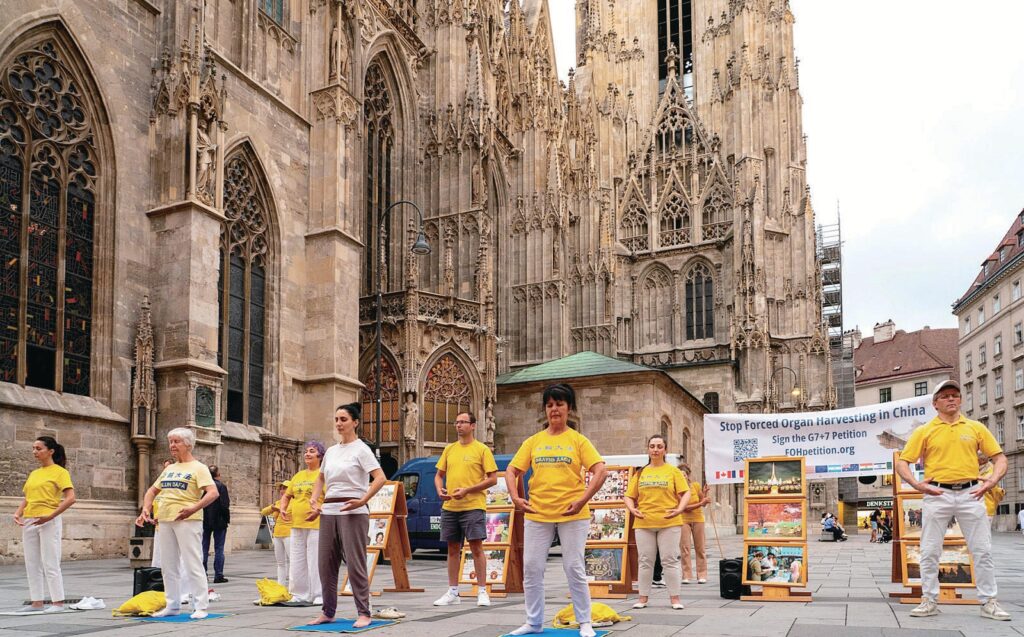 2025년 8월 29일 저녁, 유럽 10여 개국에서 온 파룬궁수련자들이 오스트리아 빈 슈테판 광장에서 공법을 시연하며 사람들에게 파룬따파(法輪大法)의 아름다움을 알렸다. 밤이 깊어지자 그들은 촛불 아래 고요히 가부좌하며 26년간 박해로 생명을 잃은 파룬궁수련자들을 추모했다.