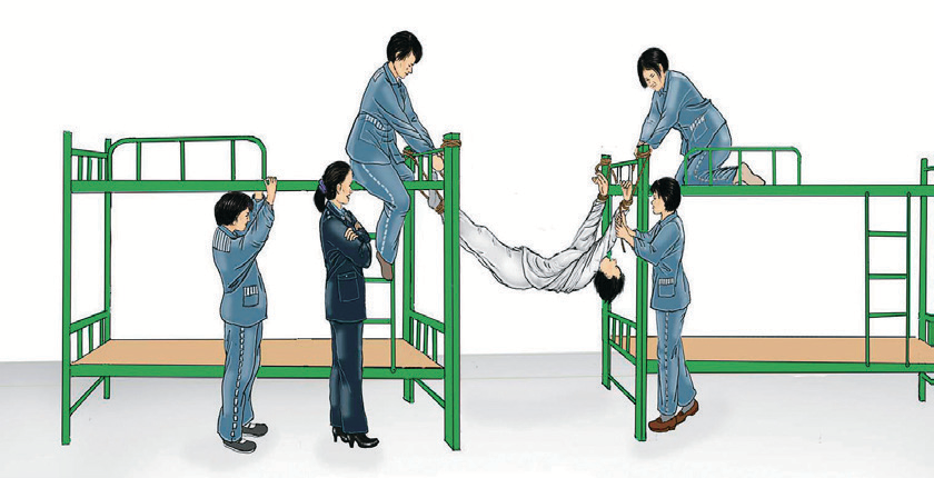 또 다른 고문도 있었다. 매일 새벽 2~3시경 무리들은 먼저 ‘적형(吊刑)’(사진3)으로 샹리제를 매달아 5시가 넘어서야 내려놓은 후, 샹리제에게 두 손과 두 발을 곧게 붙이고 손을 바짓단에 붙인 채 조금도 움직이지 못하게 강요했다. 조금이라도 움직이면 뺨을 세게 때리거나 주먹과 발길질을 가했다.