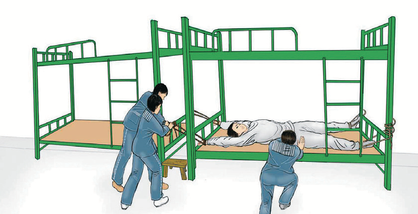 샹리제가 처음 겪은 고문은 ‘상승’(사진1)으로, 사지나 몸을 밧줄로 묶은 다음 매달거나 잡아당기는 고문이다. 이 고문은 2007년 2월부터 4월까지 이어졌으며 샹리제는 두 달 넘게 매달려 있었다.