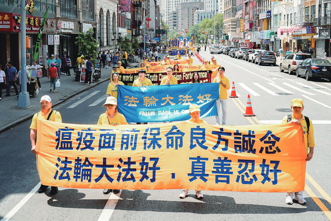 ▲ 2025년 7월 20일, 파룬궁수련자들이 뉴욕 맨해튼 차이나타운에서 대규모 퍼레이드를 개최해 파룬궁 박해 중단을 촉구하고, 4억 명 이상의 중국 민중이 중공의 당·단·대 조직에서 탈퇴한 것을 성원했다.